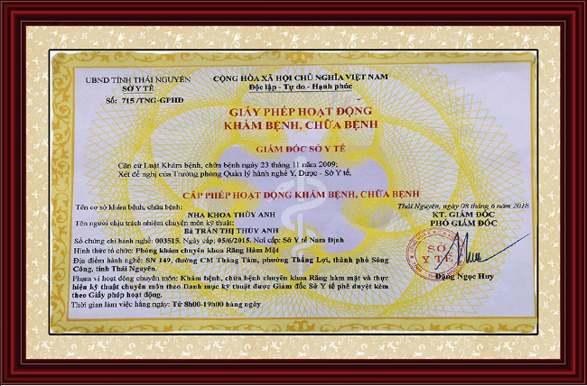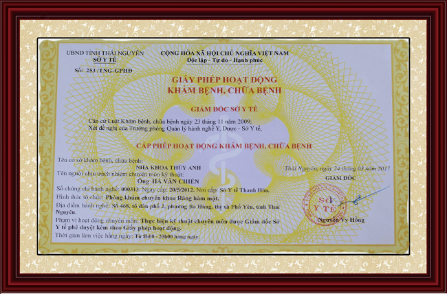 Nha khoa Thùy Anh là một trong những cơ sở Nha khoa hiếm hoi tại Thái nguyên được sở y tế thẩm định và cấp giấy phép đủ điều kiện vật chất và chuyên môn hoạt động. Chúng tôi cam kết
