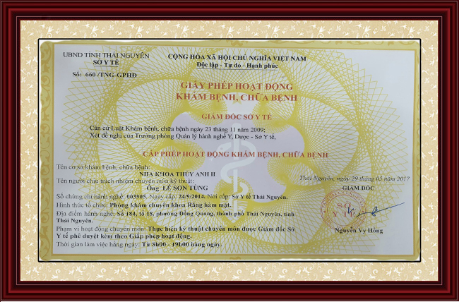 Giấy phép hoạt động được sở y tế cấp cho Nha Khoa Thùy Anh cơ sở Sông Công