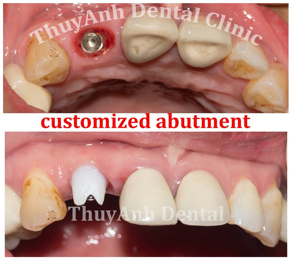 Thường abutment sẽ làm bằng vật liệu kim loại titanium, tuy nhiên đối với vùng răng cửa thì sử dụng abutment cá nhân hóa bằng sứ toàn phần sẽ cho kết quả thẩm mỹ tuyệt vời hơn, và không bị đen đường viền lợi