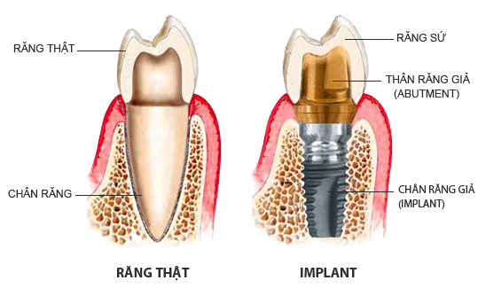 Về định nghĩa chúng ta có thể hình dung implant là 1 vít (chân răng nhân tạo) làm bằng chất liệu titanium (có tính tương hợp sinh học với cơ thể người) được cấy vào xương để thay thế chân răng mất, nhằm nâng đỡ phục hình răng sứ. Như vậy bản chất của quá trình thực hiện implant chính là cấy ghép trên cơ thể người, chính vì vậy để sử dụng được loại răng này cần có một thời gian nhất định cho vít implant ổn định trong xương hàm, thời gian trung bình cho quá trình là khoảng 3 tháng, tuy nhiên vấn đề còn phụ thuộc nhiều yếu tố chuyên môn khác nữa. Giải pháp implant hiện nay là tối ưu nhất cho các trường hợp thay thế răng bị mất vì độ bền cao, sức nhai mạnh, không phải mài các răng bên cạnh như làm cầu răng sứ
